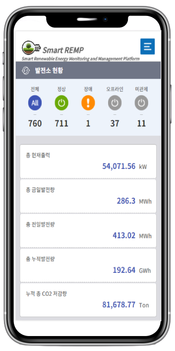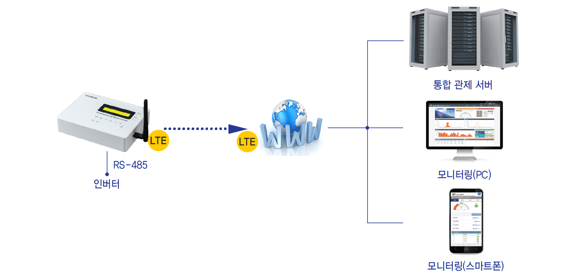 LTE 모뎀을 내장하여 통합서버에 데이터를 전송하고, 운영자가 통합서버에 접속하여 발전현황을 감시할 수 있고, 발전정보를 시간별/일별/월별로 저장, 조회, 분석이 가능하고, 이상 발생 시 이력저장으로 원인분석이 가능한 태양광 발전 모니터링 시스템입니다.